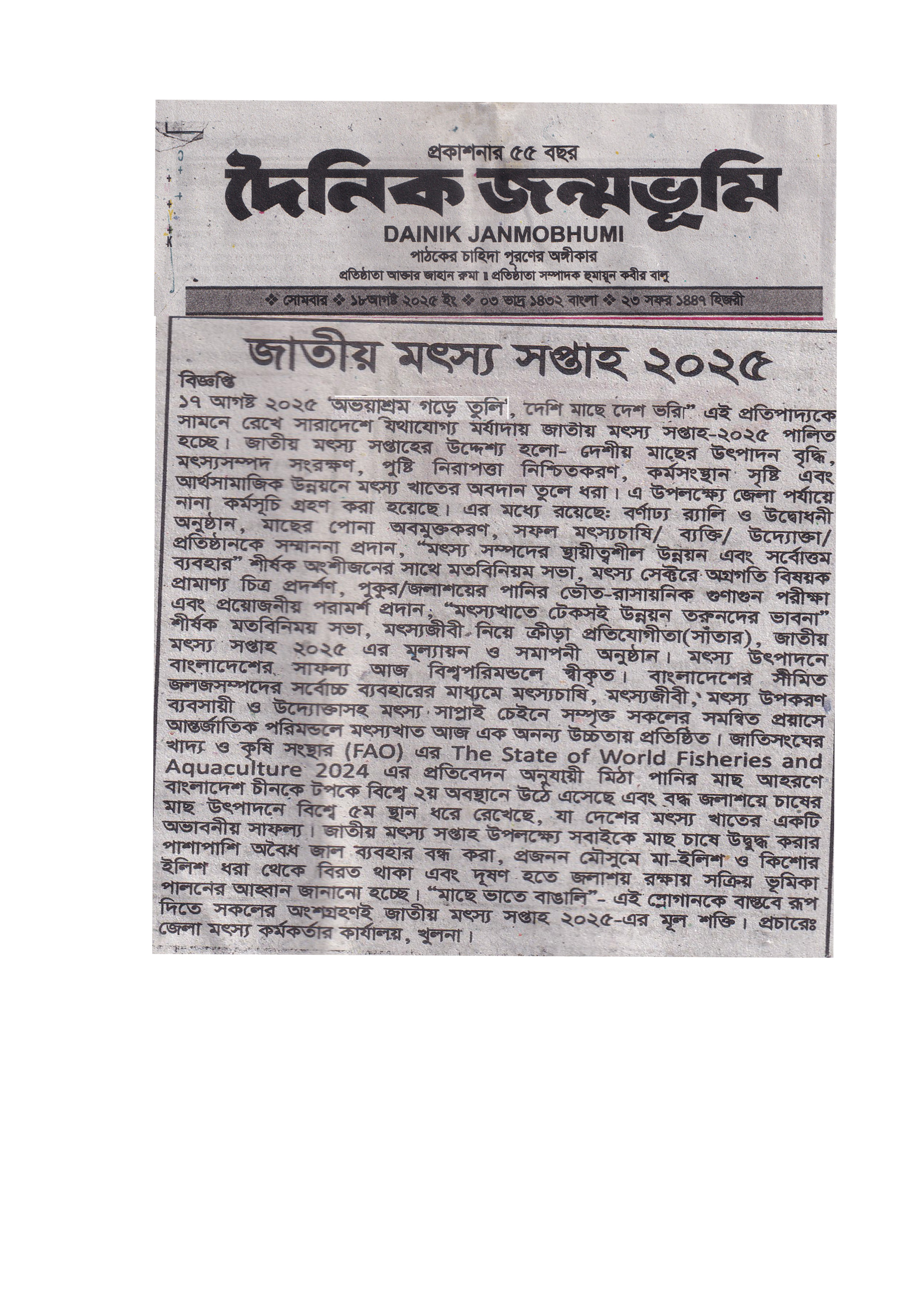 ১৫ এপ্রিল হতে ১১ জুন ২০২৬ পর্যন্ত ৫৮ (আটান্ন) দিন বাংলাদেশের সামুদ্রিক জলসীমায় সকল প্রকার মৎস্য নৌযান কর্তৃক যে কোনো প্রজাতির মৎস্য আহরণ নিষিদ্ধকালীন কার্যক্রম সংক্রান্ত জেলা টাস্কফোর্স কমিটির সভার নোটিশ।